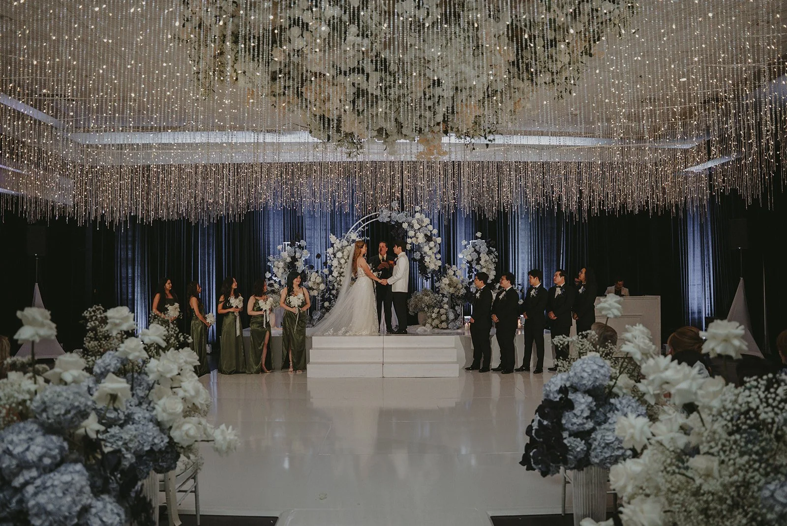 Vi and Tony’s wedding felt like a slow descent into the deep sea, pelagic and glistening. Moody blues and soft whites set an intimate tone as the evening unfolded. A traditional Vietnamese dragon performance brought movement, heritage, and joy into the space, honoring tradition while energizing the celebration. At dusk, their first dance stilled the room, closing the night on a quiet, unforgettable note.